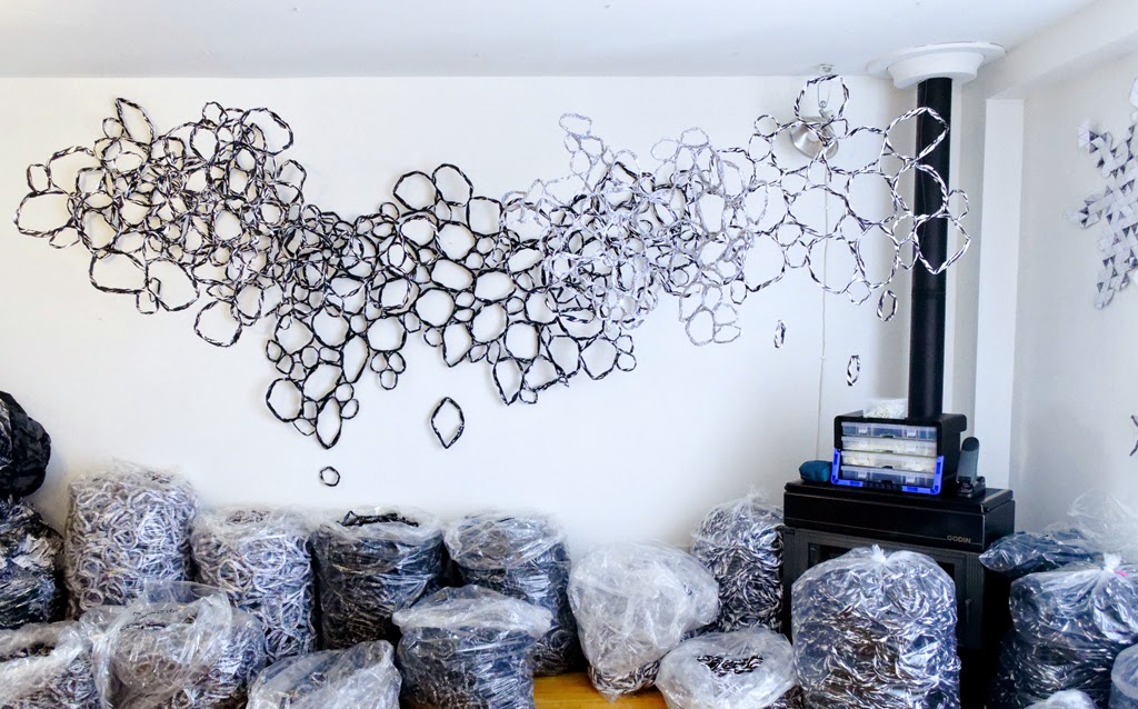Tout d'abord, l'installation Les structures critalloïdes produit pour l'inauguration du musée d'art de Joliette. L'oeuvre est réalisée avec la communauté de Joliette et sera constituée de milliers de modules de papier qui se grefferont à l'architecture du musée. Le projet sera présenté au début juin.